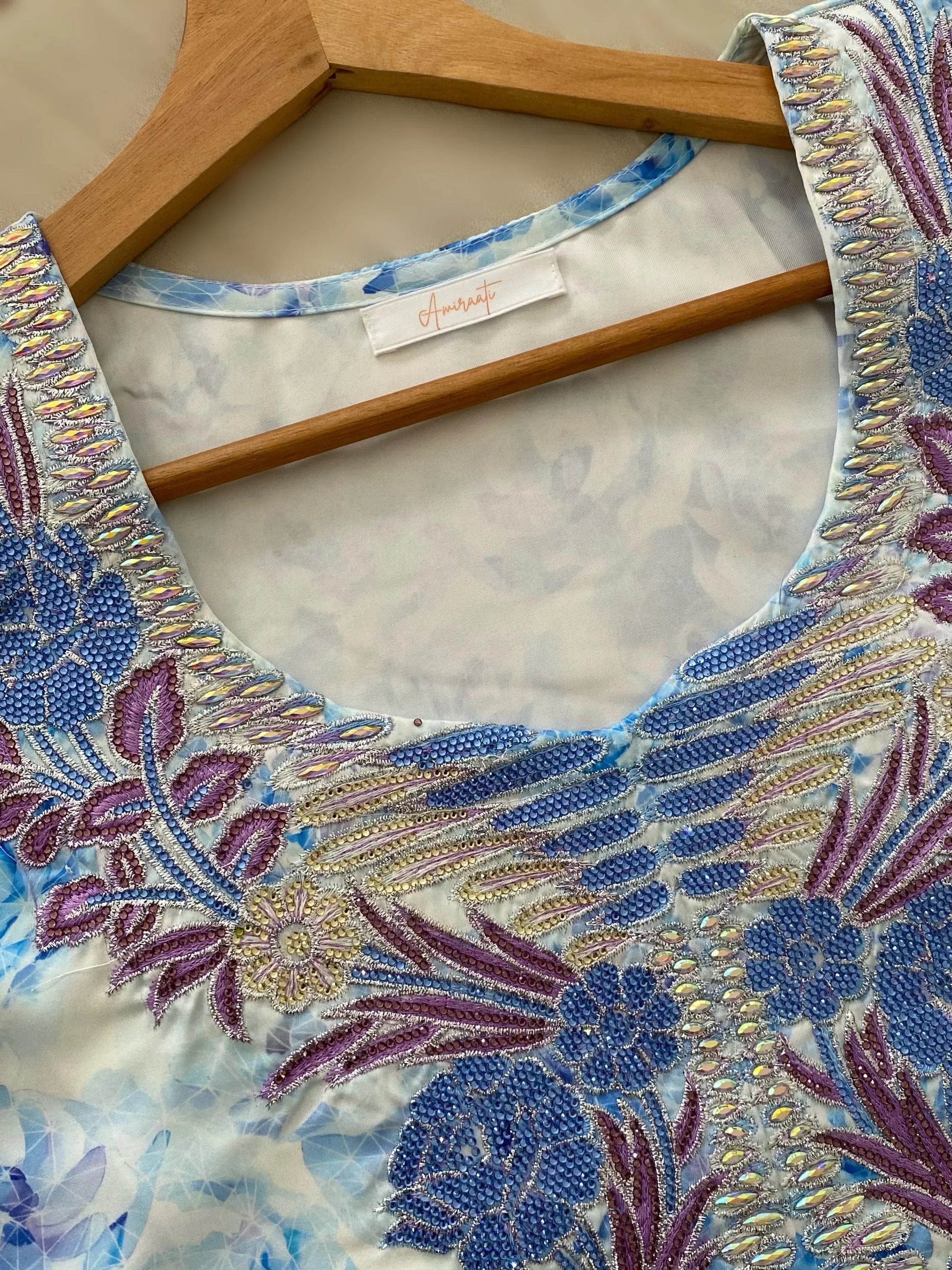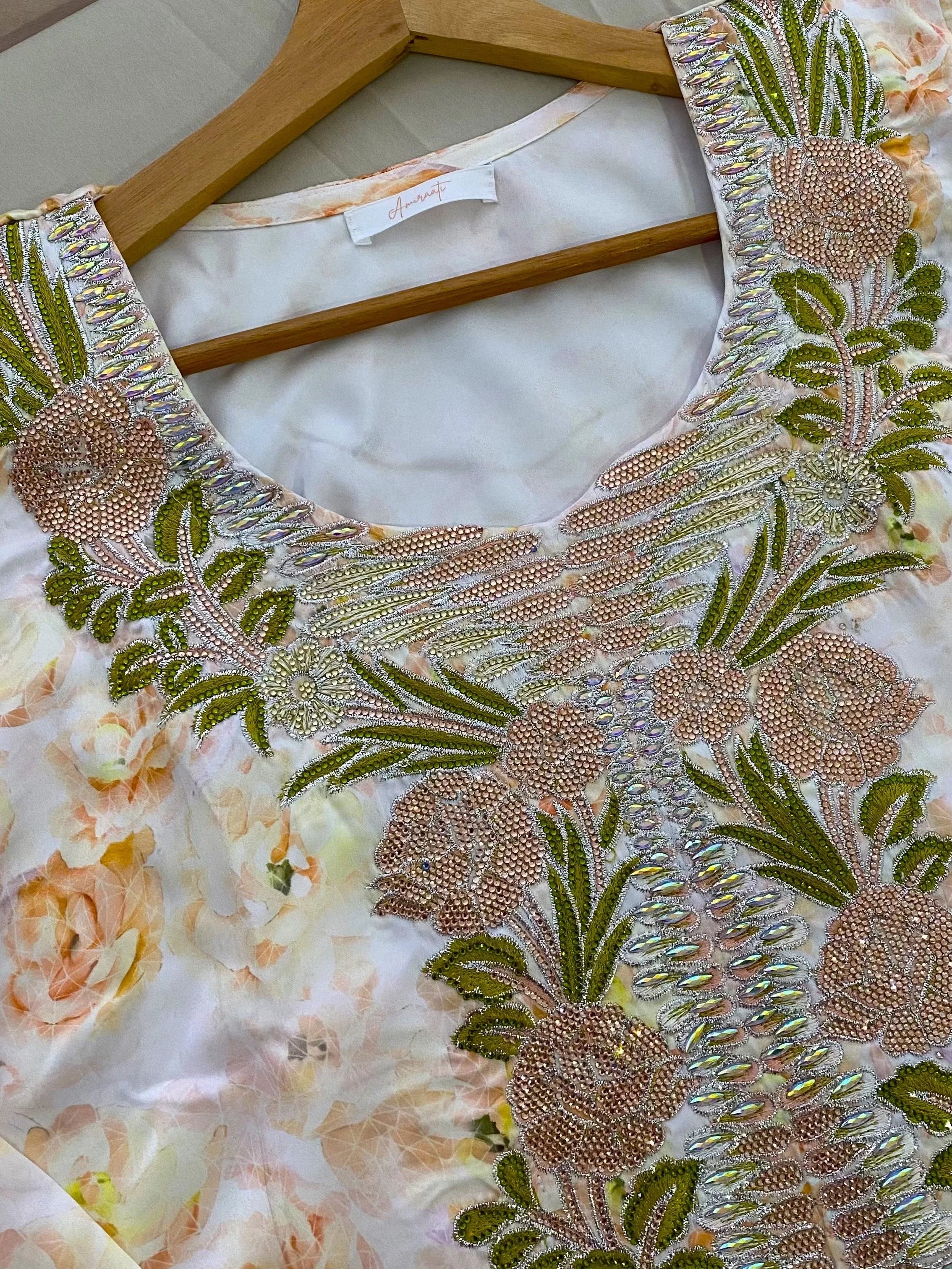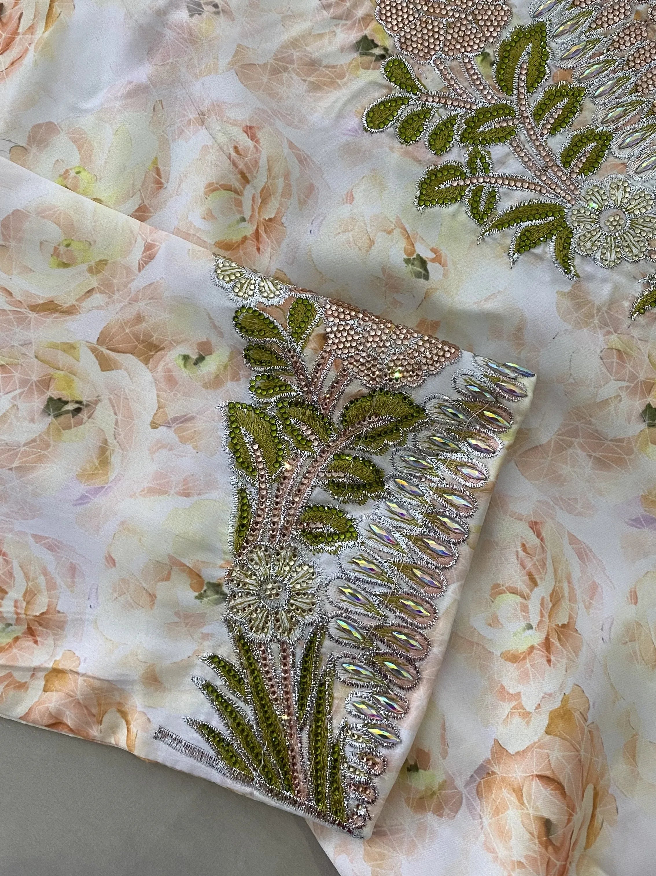 Maya évoque la fraîcheur d’un jardin printanier. Sur un tissu ivoire, des roses dégradées de rose tendre à framboise créent une toile florale douce. La broderie lilas, argent et parme s'étend gracieusement sur le buste, ajoutant une touche scintillante. En soie numérique fluide, ce Mukhawar séduit par sa légèreté et son élégance naturelle.